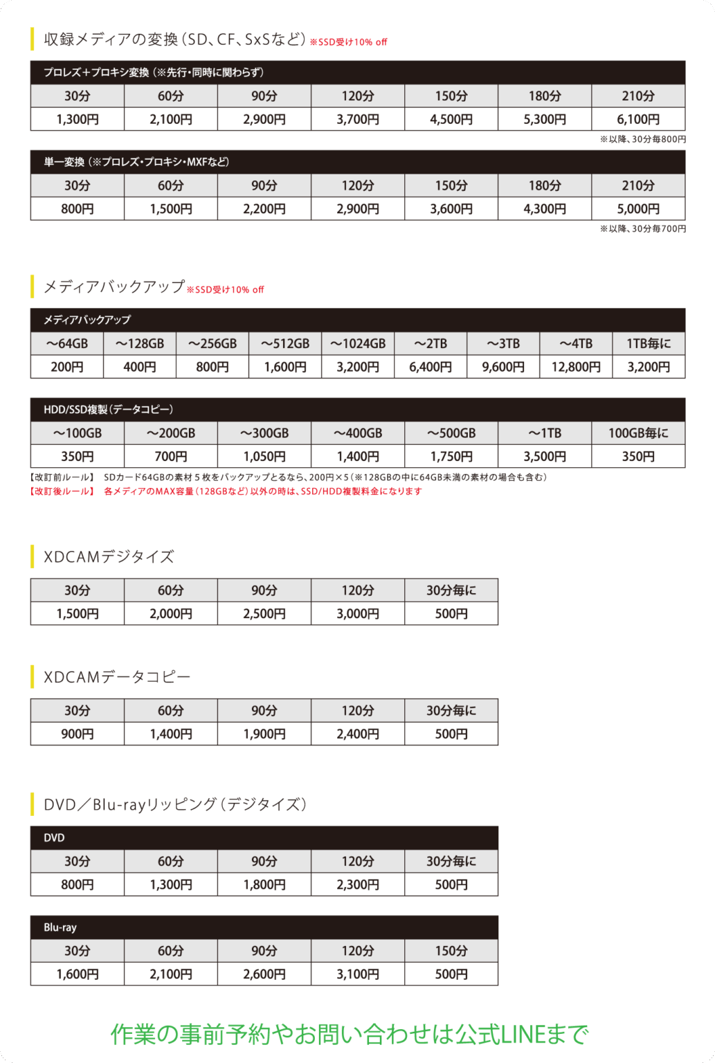 お預かりした素材の取り扱いについては細心の注意を払いますが、作業時におけるノイズ・テープ詰まりやヨレ・切断などのメディア損傷につきましては責任を負いかねますので予めご了承下さい。